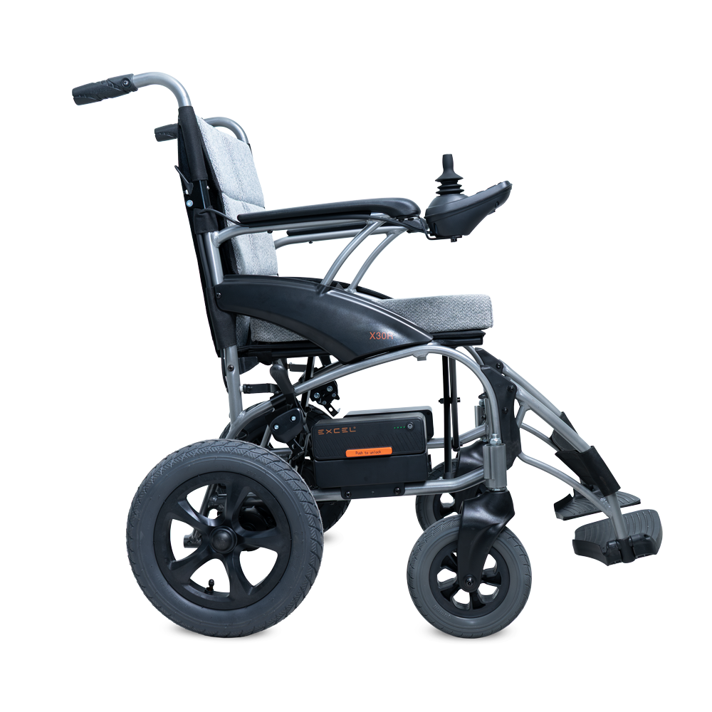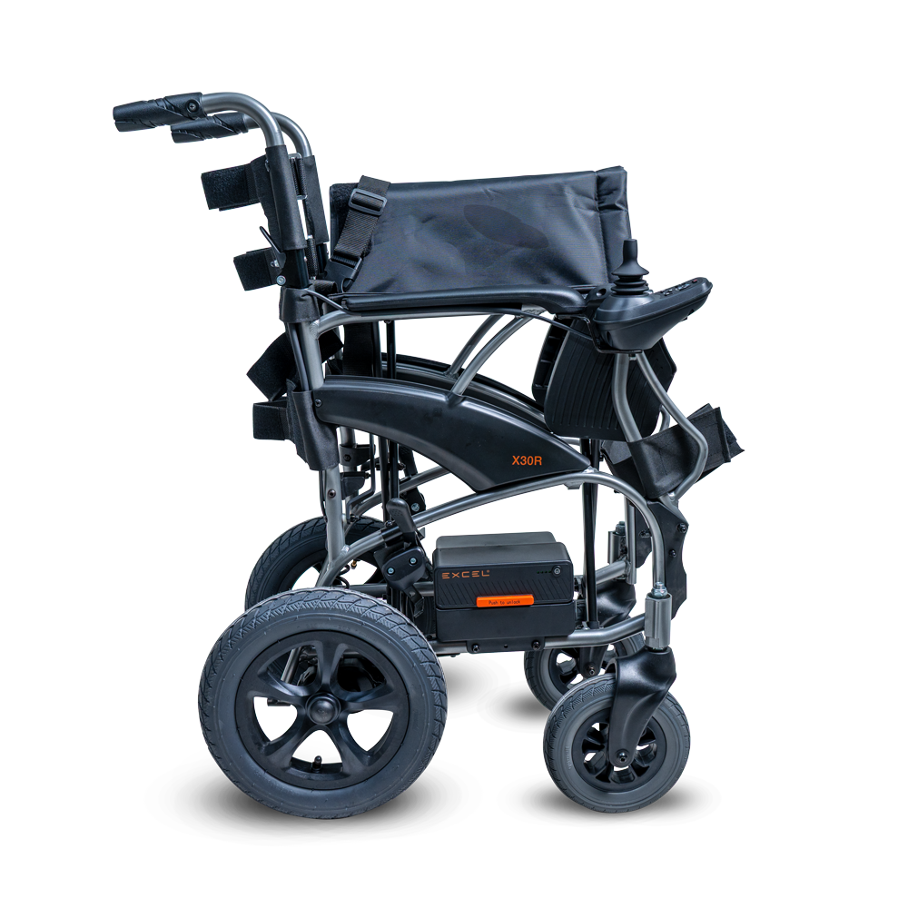 De Excel X30R is een compacte en lichtgewicht elektrische rolstoel die maximale flexibiliteit biedt voor dagelijks gebruik. Het slimme zijwaartse vouwmechanisme maakt hem eenvoudig mee te nemen in de auto of het openbaar vervoer, terwijl de uitneembare li