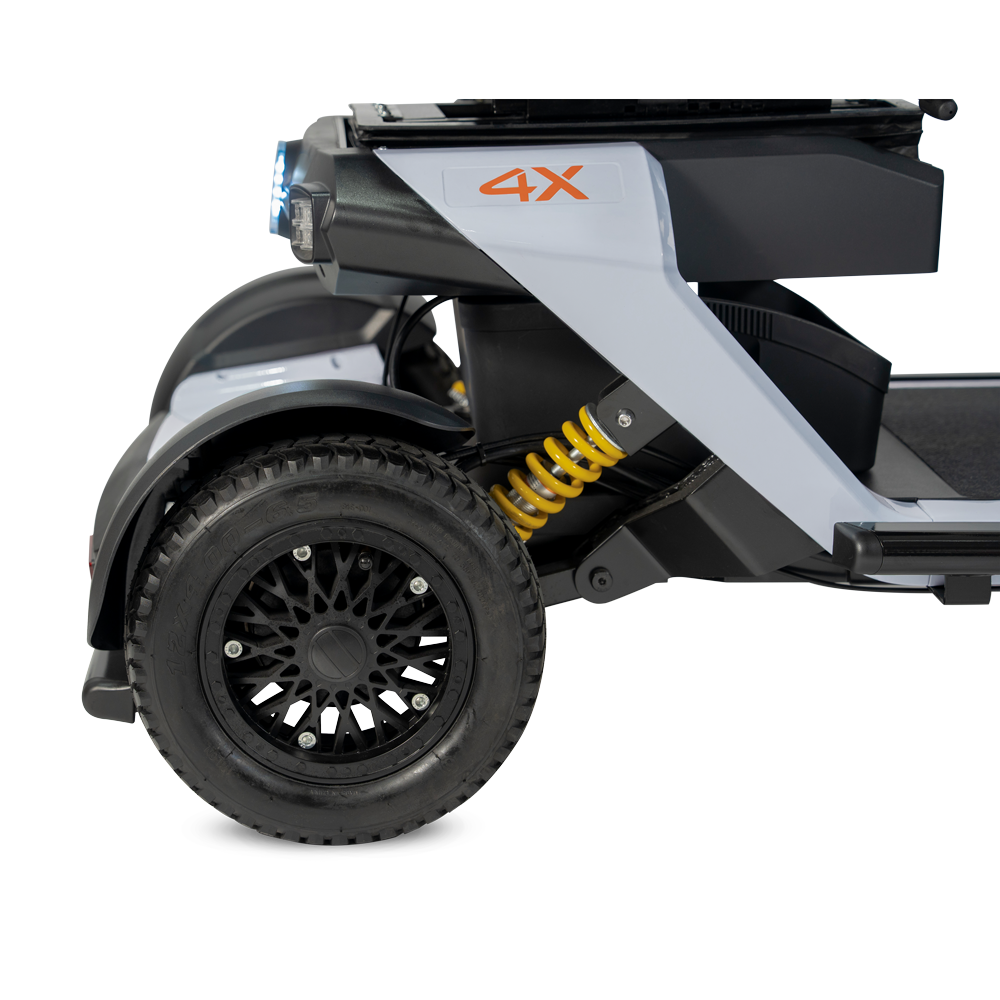 Veiligheid blijft centraal staan. De 4X+ is uitgerust met een zitsensor, keyless bediening met een unieke RFID-tag, een noodstopknop, automatische snelheidsbegrenzer in bochten en een handrem voor extra zekerheid bij stilstaan en parkeren.