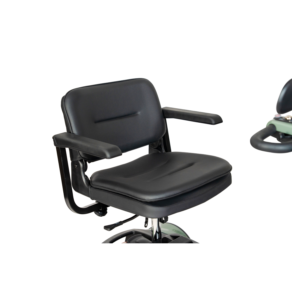 De actieradius bedraagt tot 22 km, ruim voldoende voor dagelijkse ritten. De stoel is draaibaar en afneembaar, de rugleuning is neerklapbaar en de armleuningen zijn in breedte verstelbaar. Ook de stuurkolom is verstelbaar, zodat u altijd een prettige rijhouding kunt instellen.
